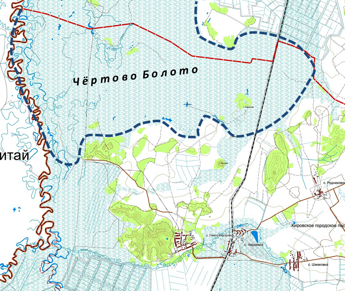 Границы «Чертово болото» (16641 га)Северная граница – проходит от р. Сунгача по административной границе между Кировским и Лесозаводским районами до условной точки в 100 м от полотна железной дороги Уссурийского отделения ДВЖД. Восточная граница - от административной границы с Лесозаводским районом по линии в 100 м вдоль железной дороги до точки напротив пахотного поля, далее по суходольной гриве вдоль пахотного поля до отметки высоты сопки Змеиная; Южная граница - от метки сопка Змеиная по прямой через гору Черемшовая сопка на расстояние 1,5 км до участка особой охранной зоны № 3 Кировского района, затем на север 2,5 км до группы озер и болота, 2 км на запад и на юг 1,5 км через Птичьи озера, до прямой через высоту сопки Змеиная и гору Черемшовая сопка, далее на запад 2 км по этой прямой и строго на север 1,5 км до торфяных болот на северо-востоке участка особо охранной зоны № 2 Кировского района по юго-западной окраине торфяных болот, затем на запад по прямой 2 км и далее на юг 2 км до проволочного заграждения погранзоны и далее на юг, вдоль этого проволочного заграждения, осушительного канала участка № 1 особо охранной зоны Кировского района и полевых выделов до пересечения с полевой дорогой в 0,5 км севернее реки Шмаковка, по суходольной гриве на северо-запад на расстоянии 2,5 км и на восток на 3,5 км до проволочного заграждения погранзоны и далее вдоль этого проволочного заграждения до р. Белой; Западная граница - от проволочного заграждения погранзоны на север по р. Белая до ее впадения в р. Сунгача, затем по государственной границе СССР И КНР, проходящей по р. Сунгача до административной границы с Лесозаводским районом. ФотографииМатериал обновлён 15.04.2021 Как вам материал?0 реакции